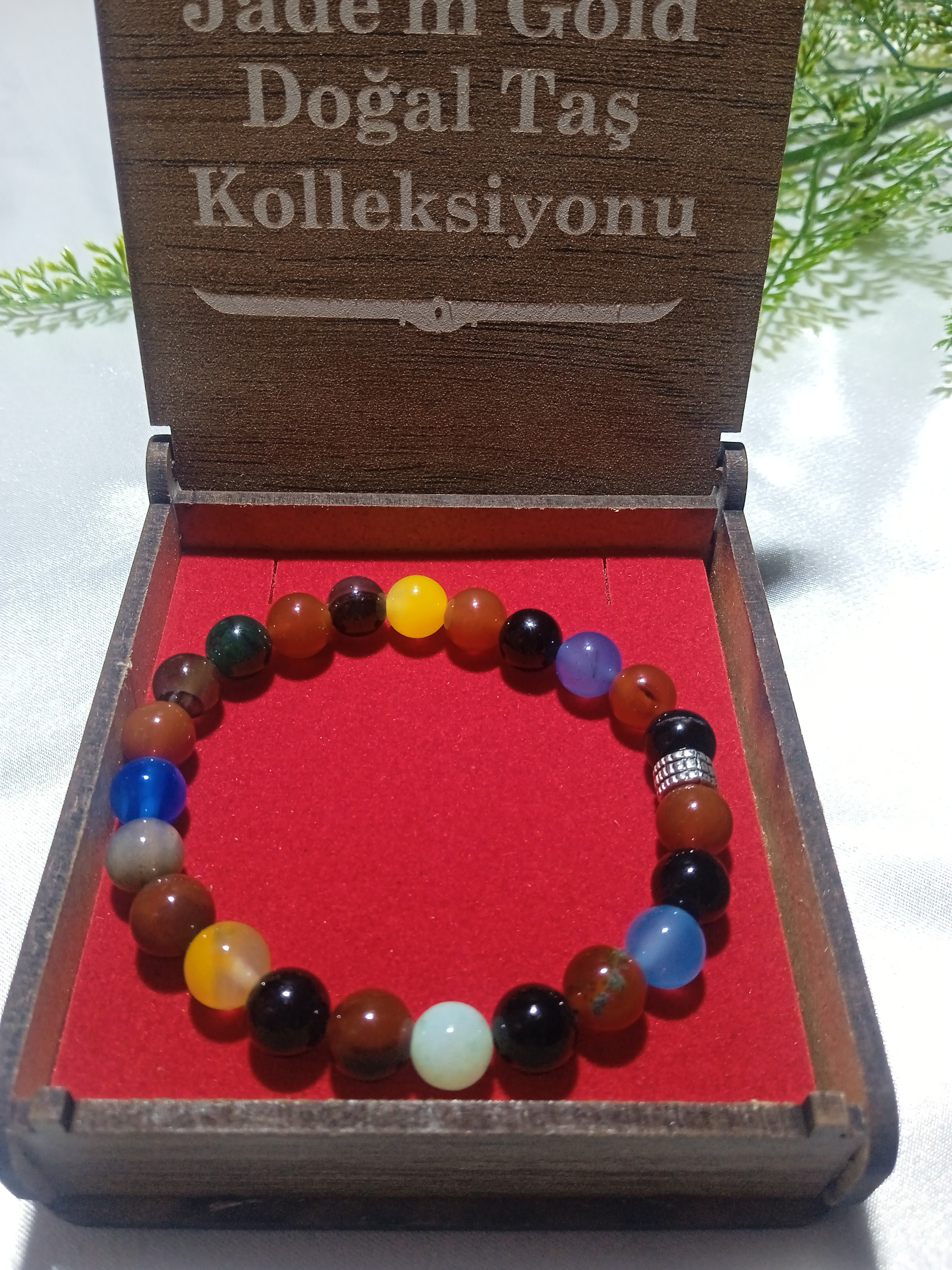 Bu yedi renkli taşın bir arada bulunması, bedeninizdeki enerjiyi dengeleyerek sağlık, mutluluk ve bolluk dolu bir yaşam sağlamaya yardımcı olur. Ayrıca, estetik açıdan da son derece şık ve trend olan bu bileklik, günlük hayatınızda ve özel günlerinizde rahatlıkla kullanabileceğiniz bir aksesuardır.